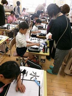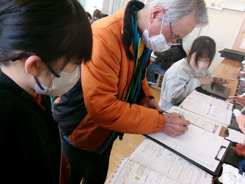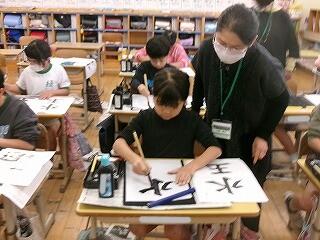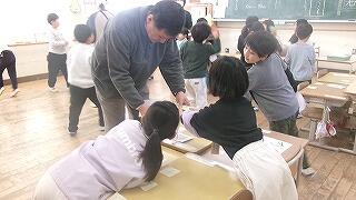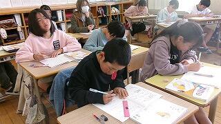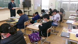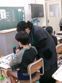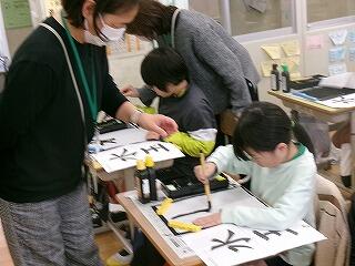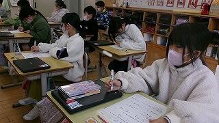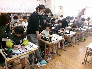 2月6日(金)、3年生が3~4校時に習字の学習を行いました。今日は5名のはげまし隊の方に習っています。とめ、はね、はらいのコツをどんどん身に付けてきている3年生です!