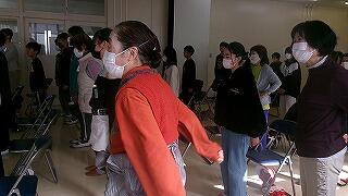 最初に健康づくり体操。入念にじっくり体を動かします。