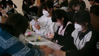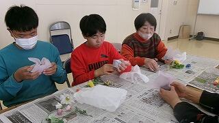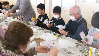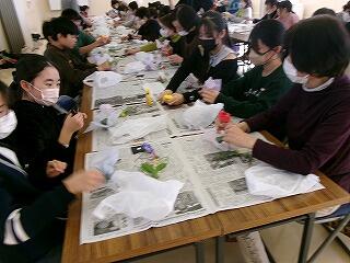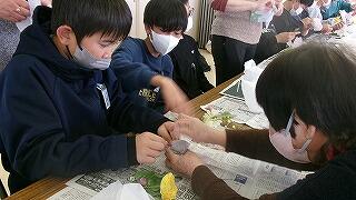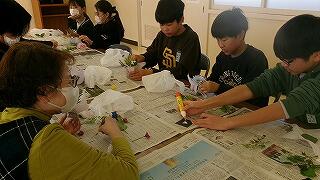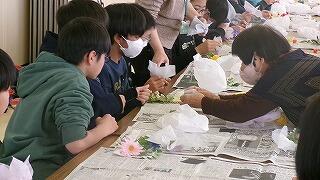 2月4日(水)、6年生の家庭科学習「共に生きる地域での生活」で、恒富南地区のコミュニティセンターに校外学習に出かけました。この単元学習は、地域で生活する人々について知り、自分の生活を地域との関わりの視点で振り返りながら、自分の生活に生かすことを目標としています。今日は、コミュニティセンターで月に2回実施されている地域の皆様の健康づくりサークルに子どもたちも一緒に参加させていただきました。地域の皆様と一緒にじっくり体操をした後、フラワーアレンジの作品を一緒に創って楽しく過ごすことができました。地域の人々の暮らしを知ることのできる貴重な体験をさせていただき、サークルの皆様に心より感謝申し上げます。