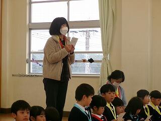 3月12日(木)、4~6年生の朝の読み語りがありました。今日で本年度最後の読み語りです。1年間、図書ボランティア「緑の風」の皆様が、選書のご準備から時間をかけ、子どもたちに温かいひとときを届けてくださいました。子どもたちの瑞々しい感性に響くたくさんのお話に出会わせてわせてくださり心より感謝申し上げます。