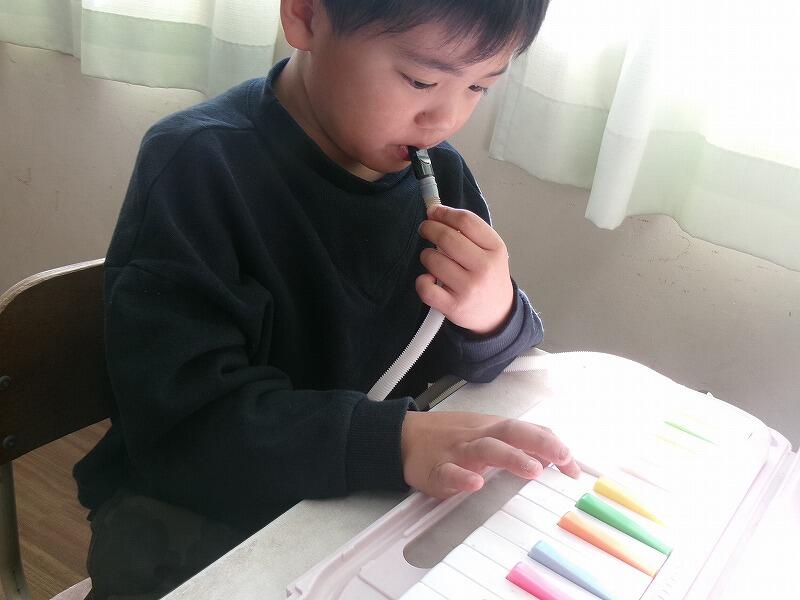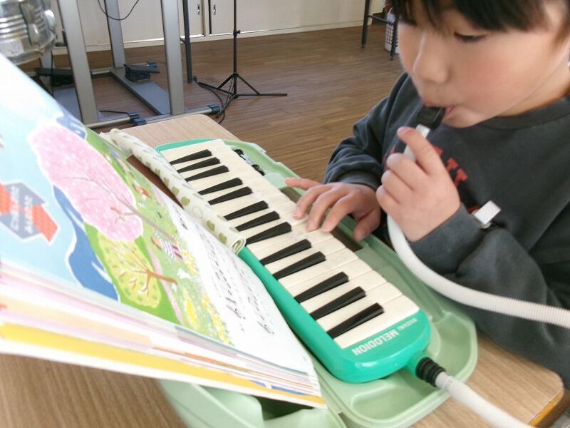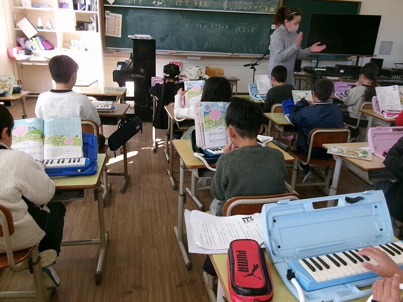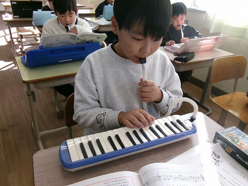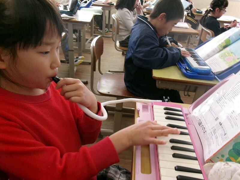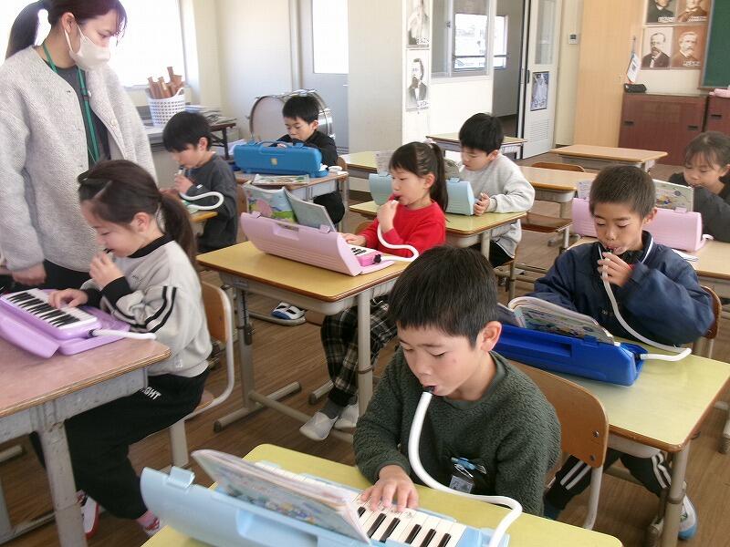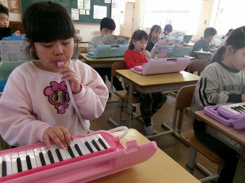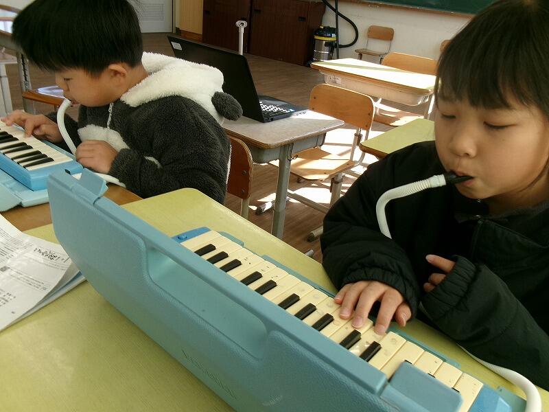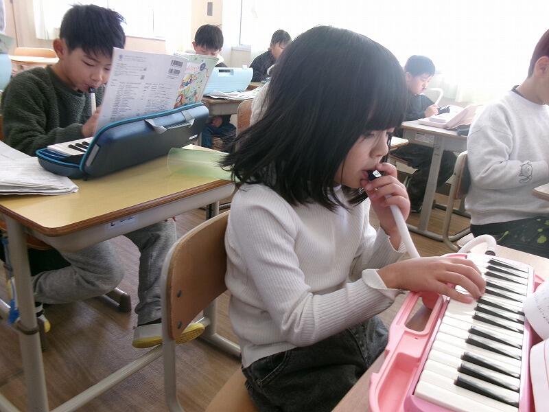 2年生は音楽です。鍵盤ハーモニカで「春がきた」の練習をしています。指づかいの仕方を覚えるのに一生懸命がんばっています。