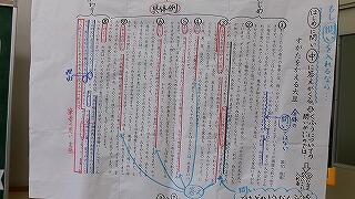 6年1組~物語文「やまなし」の解釈の学習です。登場するものや出来事と、宮沢賢治の生き方とを比べて置き換えながら読む学びに挑戦です。本時は、題名「やまなし」に込められた作者の意図に迫るための話し合いを深めました。粘り強く作品に向き合って思考を重ねている6年生です。