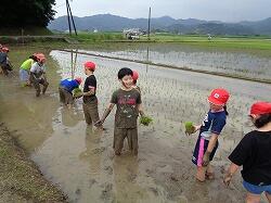 6月20日(火) 5年生が田植えの体験をしました。社会科で米作りの勉強をして、総合的な学習で課題をもって取り組んでいます。農家の方とJAのみなさんのご協力で、田んぼを貸していただき、米作りについて学びを深めます。はじめは、裸足で田んぼに入る感触に戸惑い気味でしたが、いつの間にか泥だらけになっている子どもたちも見られました。楽しかったという感想がたくさんありました。米作りの大変さや、農家の方の米作りにかける想いなどにも気付いてくれたことと思います。10月の稲刈りが楽しみです。