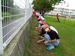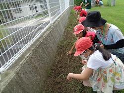 7月31日(金) 1学期の終業式の後に、全校児童で校内にコスモスの種をまきました。これは、今年から始まった「みどりがおかコスモスプロジェクト」の最初の行事です。緑ヶ丘地区をコスモスいっぱいにするために、今年度はまず、校内をコスモスいっぱいにして、その種を広げていきます。この日は、この活動に賛同していただいた、地域の方や保護者のボランティアから15名も参加していただきました。6年生が進行や指導をして、各学年に分かれて種をまきました。心配だった雨も、少し降りましたが、何とか活動することができました。参加されたボランティアの方も楽しそうでした。このボランティアの方にも協力をいただき、コスモスの開花に合わせていろいろな取組をしていく予定です。秋には、たくさんの花とみんなの笑顔が咲き誇ることでしょう。