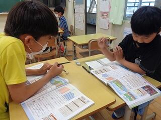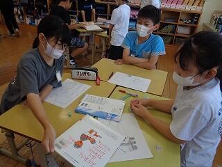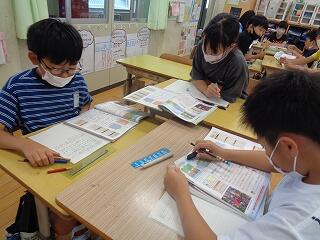 〇4年生は社会科で、課題について一人調べをした後、グループで意見を出し合っていました。学習の仕方をどの児童もよく理解できているようで、進んでとりかかっています。