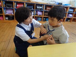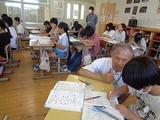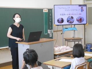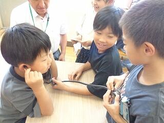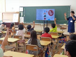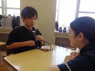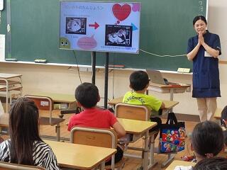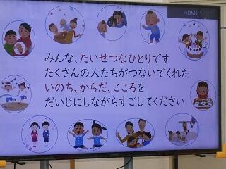 7月17日(木)、2年生のよのなか教室が開かれました。講師は縁在宅クリニック看護師の黒木笑美先生と尾﨑由紀江先生です。お腹の中の赤ちゃんの写真や動画を観たり、絵本の読み聞かせをしていただいたり、聴診器で自分たちの心臓の音を聴く活動をしたりと、いのちの尊さについて感じることのできる学習でした。黒木先生、尾﨑先生、お忙しい中ご指導いただき誠に有り難うございました。