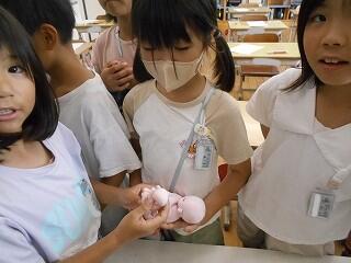 3年生が図画工作「空きようきのへんしん」を楽しんでいました。白いくっつく粘土に、絵の具を混ぜてお餅のようにこねるとカラフルな粘土に!持ってきたペットボトルなどの容器に粘土をくっつけて小物入れやペン立てなどができあがっていました!