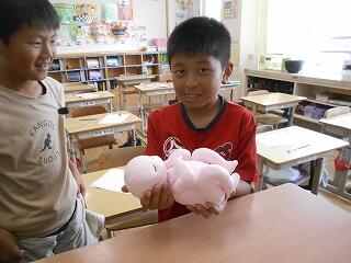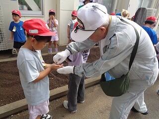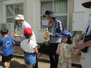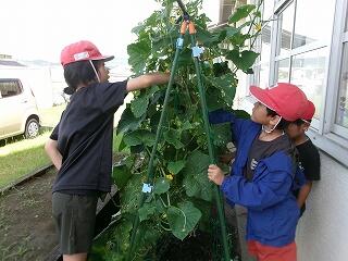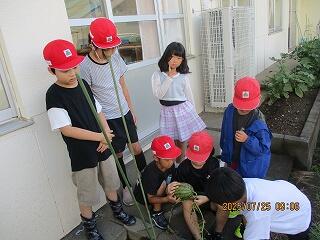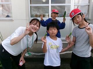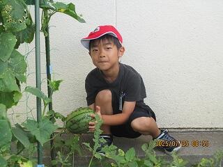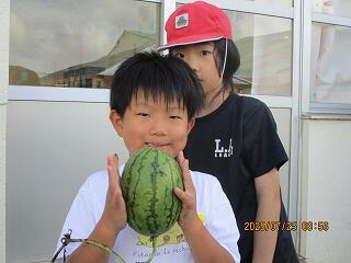 7月25日(金)ひまわり1、2では、野菜の収穫で盛り上がっていました。自分のお顔ぐらいの大きさに育ったスイカが教室の前の小さな畑に2つ実っていました!他にもきゅうり、オクラ、ピーマンも収穫できました。みんな大喜びでした。きっとおいしいことでしょう!