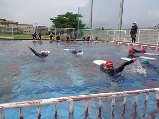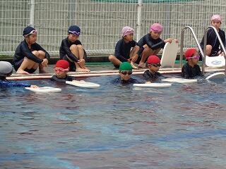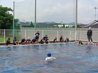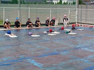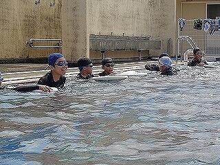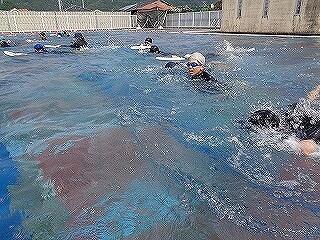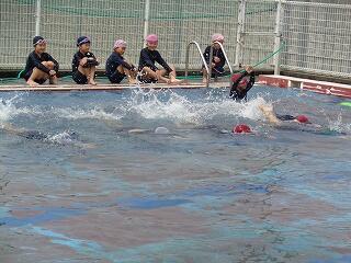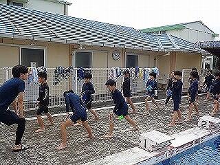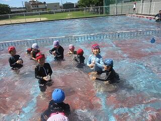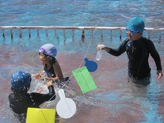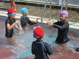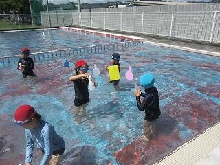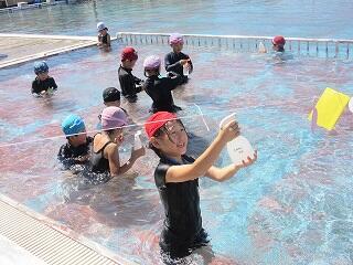 1年生がプールで「水でっぽうであそぼう」を楽しみました。自分たちで用意した水でっぽうを使って、勢いよく飛び出す水に大喜びの1年生。青空の下で、夏らしい遊びに夢中になりました。