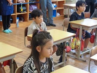 1年教室では先生の読み聞かせの最中でした。前の方にあつまって、お話の世界に夢中です。