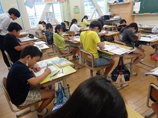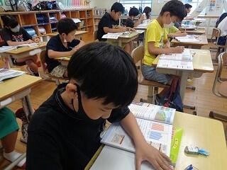 7月18日(金)の授業中の様子です。学期末の整理期間に入り、テストをしたり、戻ってきたテストのやり直しをしたり、終わった人からドリルやプリント、読書をしたり・・の様子が多く見られました。来週から全学年個人面談週間です。1学期のテスト実施の状況について、個別にお知らせし、児童のよさやこれからの目標を共有したいと思います。