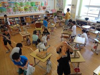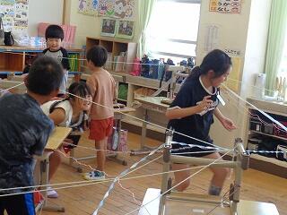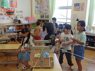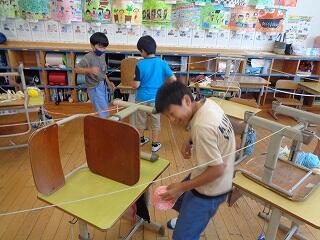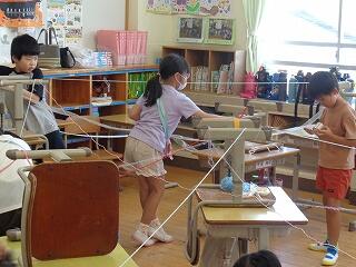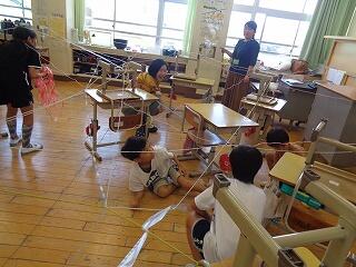 7月22日(火)、3年生が図工「ひもでつないで」の学習に夢中になっていました。学校にある長いひもやロープ、平テープ、さらに自分で持ってきたひも等を使って、教室がまるでクモの巣みたいなアートスペースに!あちらこちらにひもが交差する中をかいくぐりながら、子どもたちの世界観がふくらんでいるようです!