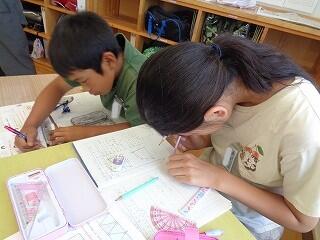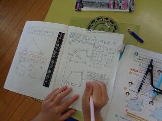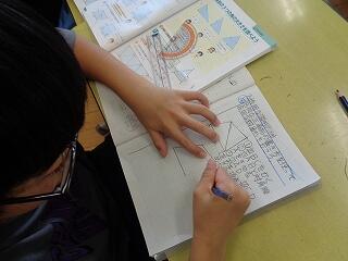 5年生は算数「合同な図形」の学習です。合同な三角形の描き方を使って、合同な四角形の描き方を練習しています。ノートにていねいに描いている5年生です。