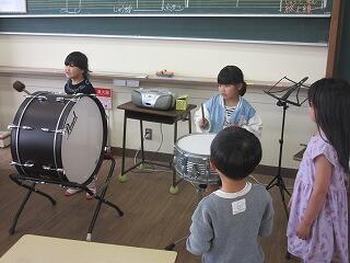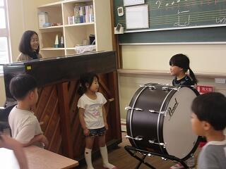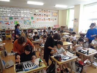 今日から月曜日のお昼休みに、音楽室で楽器に親しむ時間を作ってくださるボランティアの池田さんがお越しくださっています。今日は1年生の日です。初めての音楽室での楽器遊びです。池田さん、ありがとうございます。よろしくお願いいたします。