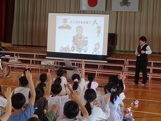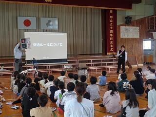 5月15日(木)、梅田学園自動車学校の方を講師にお招きして、交通安全教室を開きました。はじめに交差点で気をつけることや自転車に乗る時のルールなど、映像を見ながら学んだ後、横断歩道の安全確認について実際に練習しました。また、6年生に延岡警察署様より「ハンドアップマイスター」任命書の授与が行われました。手を挙げて横断歩道を渡る手本として任命された6年生に期待が寄せられています。今日の学習を通して、危険から身を守るための正しい知識と判断力を育み安全な生活の基本を身に付けてほしいと願っています。本日はお忙しい中、ご指導いただきました梅田学園様、延岡警察署様、誠に有り難うございました。