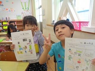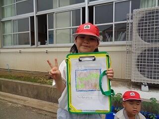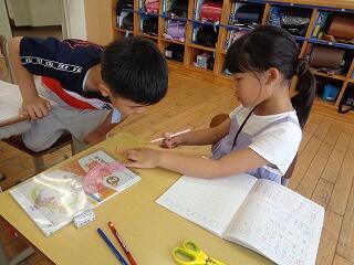 1年生は、学校たんけんで発見したことを生活カードにまとめていました。