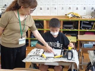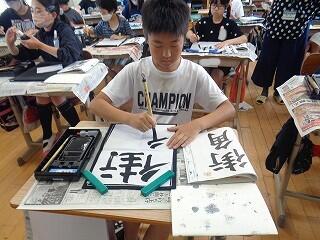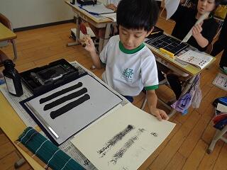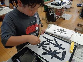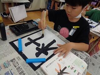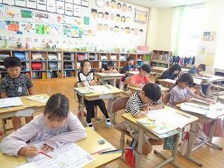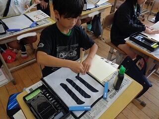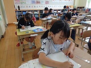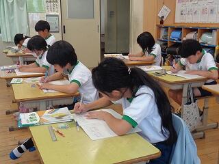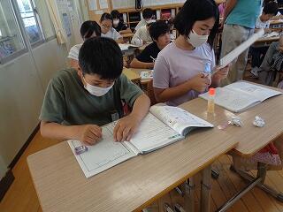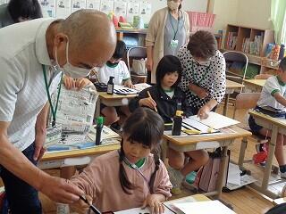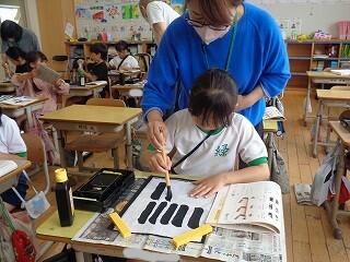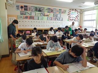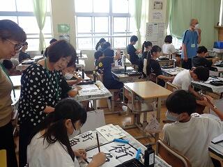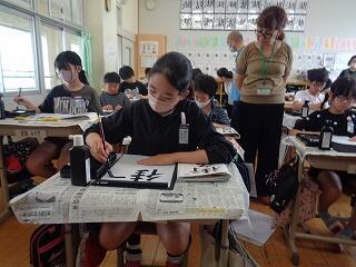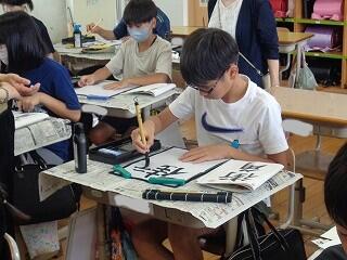 6月17日(火)、6年生が、書写はげまし隊の方と一緒に習字の学習です。今日は「街角」を書きます。めあては「3つの部分をもつ漢字の字形を整えて書こう」です。書き方のポイントをはげまし隊の方々に一つ一つ教えていただきながらみんな熱心に練習しました。はげまし隊の皆様、ご指導誠にありがとうございました。