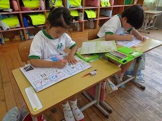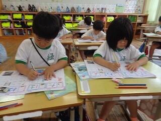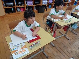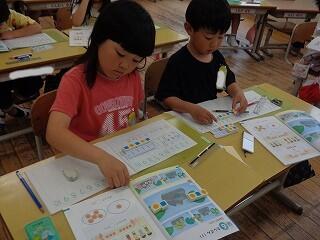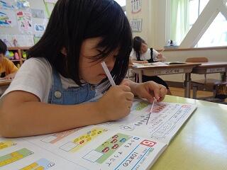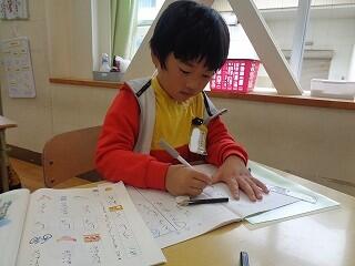 〇1年生は算数でたしざんの勉強です。ブロックを使って問題に取り組んでいます。ノートのとりかたも大変上手です。