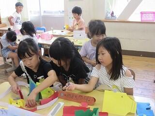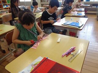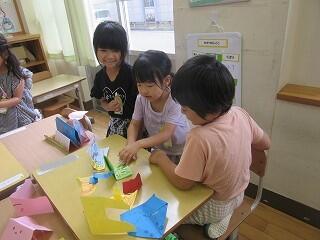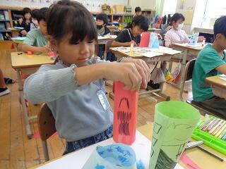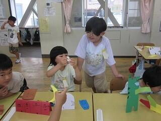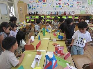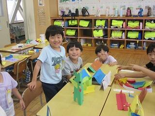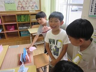 6月16日(月)、1年生が図画工作「折って立てたら」の作品を作って作品を見せ合っていました。