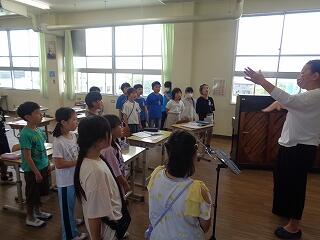 5月21日(水)、1年生は音楽で「~さん」「は~い」とフレーズに乗ってよびかけごっこをして楽しんでいました。