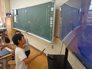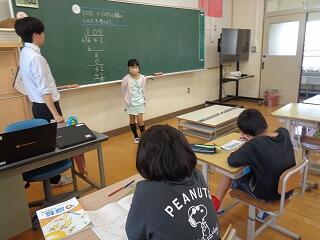 5年生は算数「少数のかけ算」です。今日の学習のめあてを確認して始まります。