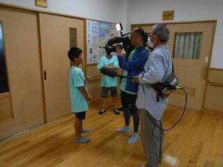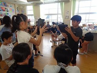 5年生~外国語「自己紹介」各グループに分かれて、英語で自己紹介をし合います。動画で撮影するカメラマンもいます。