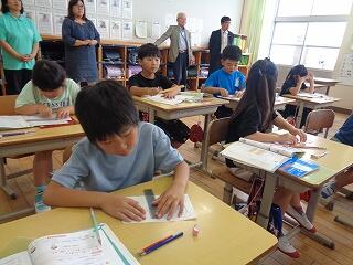 3~4校時は3年生の書写の学習でした。本年度も書写はげまし隊のボランティアの皆様がお越しくださり、子どもたちに指導してくださいます。今日は6名の方が見えられご指導くださいました。また、子どもたち一人一人の名前の見本や、習字の炭を吸い取る紙をプレゼントしていただき、みんなでお礼を言いました。本年度も大変お世話になります。よろしくお願いいたします。