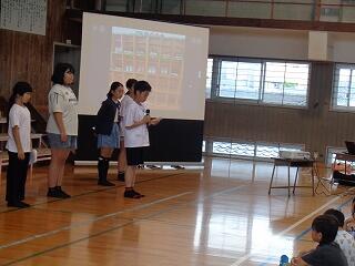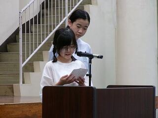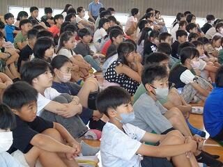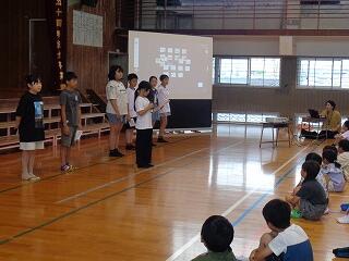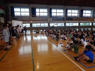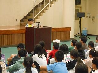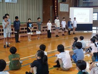 6月24日(火)は7月に向けての全校朝会です。校長先生からは、「あったか言葉」についてのお話です。「肯定ペンギンと否定ペンギン」のお話の読み聞かせとともに、肯定的な言葉と否定的な言葉について考えました。続いて、美化委員会からのお話です。「あとしまつ」の大切さについて伝えるために、美化委員会の5、6年生がこれまで発表内容を準備してきました。実際に手本となる例や、気をつけてほしい例を写真で提示しながら、とてもわかりやすく伝えることができました。続いて、生活指導部から、7月の生活目標や、安全な登下校の仕方、水の危険等についてのお話、学習指導部からは、聞く姿勢など学習の作法のお話がありました。最後まで、どの学年も聞く態度を心がけることができる全校朝会でした。