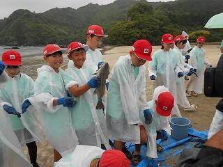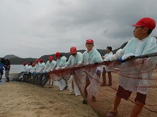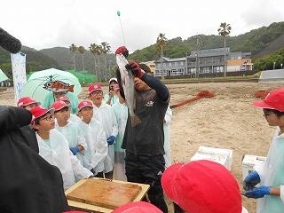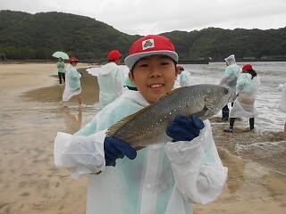 5月29日(木)、6年生の「海と緑ヶ丘小プロジェクト」第2弾が行われました。今日は、須美江海水浴場での地引き網体験です。mrt宮崎放送様と「さかな芸人」ハットリさん、そして宮崎大学の村瀬准教授が一緒に活動してくださいます。また、現地では、「民宿紺碧」の甲斐宏明様が地引き網体験をお世話してくださいました。地引き網で獲れた魚で魚フライカレーもいただきお腹いっぱいになりました。最後に、すみえファミリー水族館へ行き、たくさんの魚について村瀬先生とハットリさんにたっぷり解説していただきました。今日の体験活動を通して、延岡の海に生息する魚について知り、魚と環境との繋がりを学んだ6年生。どんどん好奇心が膨らんでいます。次の第3弾が楽しみです。海の恵みを体感することのできる大変有意義な機会を賜り、関係者の皆様に心より感謝申し上げます。
