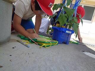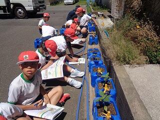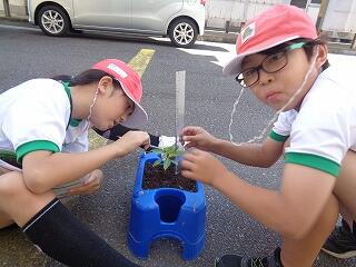 1年生が生活科であさがおの観察をしていました。毎日水やりをしている1年生、元気に芽が出てきているようです。