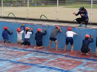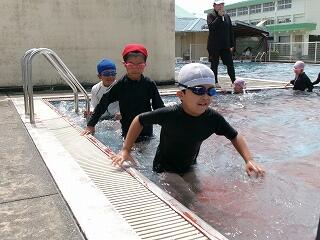 6月24日(火)、いよいよプール学習がスタートしました。トップバッターは、1・2年生です。1年生は小学校初めてのプール記念日。2年生に教えてもらいながら水に慣れる練習から始まりました。