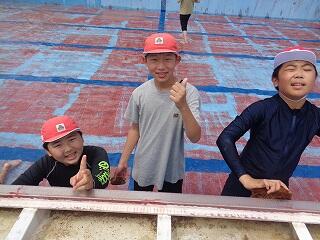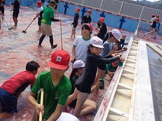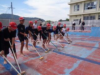 6月6日(金)に、5年生と6年生によるプール清掃を行いました。プールの中やプールサイド、側溝、トイレ、更衣室など、役割を分担して一気にとりかかり、1年ぶりのピカピカのプールに変身。汗ばむ晴天の下、水とたくさん戯れながらお掃除を頑張りました。プール開きは今月23日です。子どもたちが水しぶきを上げて元気に学ぶ姿を、プールも心待ちにしているようです!