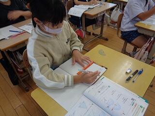〇4年生は算数「角とその大きさ」で、分度器を使った角の描き方を学習していました。しっかり話を聞いたり、友達と活動したりと熱心な学習態度です。