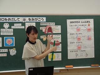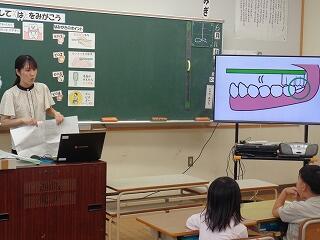 6月11日(水)、歯と口の健康週間にあわせて、保健室の先生が1年生の歯磨き指導を行いました。乳歯と永久歯のお話や、歯を守るために大切な上手な歯磨きの仕方など、図や写真をみながら楽しく学びました。最後に実際に歯磨きの練習もすることができました。今日からまたさらに磨き方を意識しながら歯磨きができることでしょう。