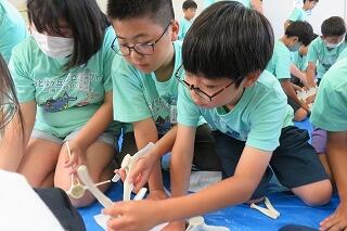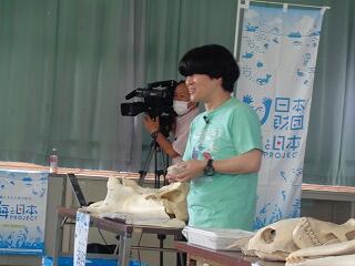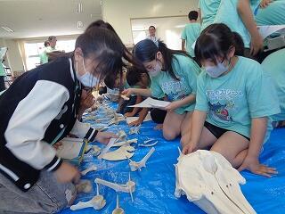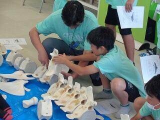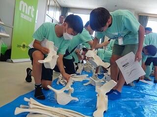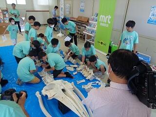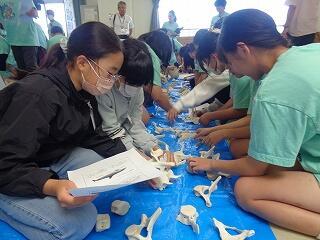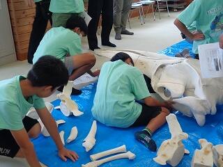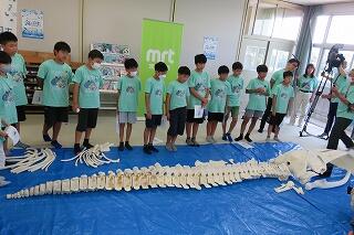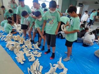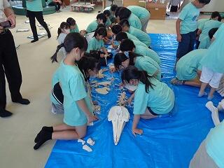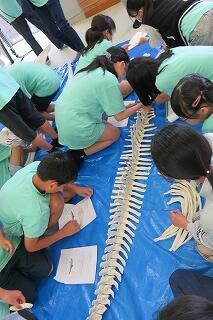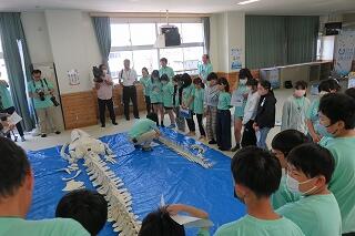6月19日(木)、6年生の「海と日本プロジェクト」の第4弾が開かれました。本日は学校に、宮崎大学 教育学部 理科教育・生物講座教授の西田 伸 先生が講師に見えられ、海の生物の多様性やゴミ問題等についてお話しくださいました。また、4メートルほどのクジラの骨をお持ちくださり、分解されたパーツをみんなで並べて完成させる活動を行いました。クジラの骨格を間近で体感することができ、大喜びの子どもたちでした。プログラムの後半は、海ノ民話「琴姫の松」を視聴し、地元に言い伝えられているお話を学びました。本プロジェクトも次回の5回目で終了します。地元の海を知るところから始まり、様々な海の豊かさを学んだり、体験したり、そして海で起きている問題を目の当たりにしたりしてきた6年生。最後は海と共生する未来を考えていくプログラムが予定されています。豊かな学習体験をいただき関係者の皆様に心より感謝申し上げます。