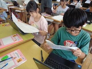 6月25日(水)5年生の国語科の学習です。本校の主題研究「ひなたの学びを意識した授業づくり~国語科『読むこと』の指導を通して」に向けた第1回目の研究授業の単元が始まっています。叙述の見方・捉え方を習得していくための学びに一生懸命に取り組む5年生。友達の発言を聞いて何度も叙述に立ち戻って再考し、みんなで納得解を求めて話し合う中で、自分の考えに変容が生まれるような読みの深まりを体験してほしいと願っています。「ひなた ~一人一人が問いをもち、仲間となって学び合い、高めよう深く考える力」の姿を目指し、日々の授業改善を図ることを通して、授業力の向上に努めてまいります。