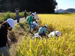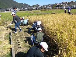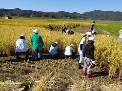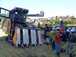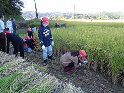 10月23日(月)5年生が稲刈りをしました。田植えをしてから約半年、たわわに実った稲に子どもたちもびっくりしていました。まずは、一人一人が鎌を持ち手刈りをしました。多少ぎこちないものの、みんな一生懸命刈り取っていました。その後、機械で脱穀もしました。手刈りの残りは、大型コンバインであっという間に刈り取られ、その後、薬剤散布用のドローンやヘリコプターの実演も見せていただきました。手刈りで苦労しただけに、最新機械の性能にみんなびっくりでした。お世話になった農家の方は、田植えから毎日田んぼを見に来てくださったと聞きました。毎日見に来られる方の稲は育ちがよいと言うことも聞き、手と愛情をかけることの大切さも分かったと思います。米作りの苦労のほんの一部しか体験していませんが、ごはんを食べられることへの感謝の気持ちが高まったにちがいありません。