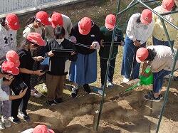 10月20日(金)3年生が「空飛ぶたまねぎ」の苗を植えました。先日講話をしていただいた農家の方に再び来ていただき、学校内の畑に1人十数本の苗を植えていきました。先日見た小さな種から苗ができ、さらに成長してタマネギになる。その成長と、農家の方の苦労や楽しみが少しでも感じられるように、大切に育ててほしいと思います。