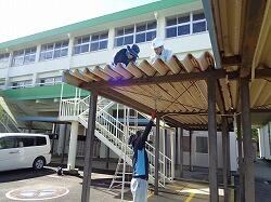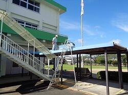 9月11日(月) 校舎と体育館をつなぐわたりそうか屋根を修理しました。設置されてから何十年も経っていることもありますが、本校は海にも近いので、鉄類がさびやすくなっているようです。屋根の継ぎ目などに穴が開き、雨が降ると雨漏りがする状態でした。今日は、本校の技術員さんが、市教委の技術員さんにも手伝っていただき、雨漏り箇所の修理をしてくださいました。いろいろな方のおかげで、子どもたちが安心して過ごせています。ありがとうございます。