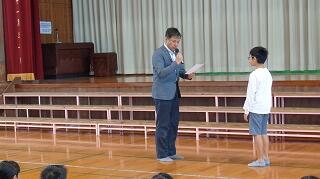 続いて、図書委員会が「いろいろな分野の本を読もう」についてパワーポイントで発表し、図書室の本の種類を図書委員さんが紹介してくれました。最後に、表彰式です。下記の児童が入賞しました。