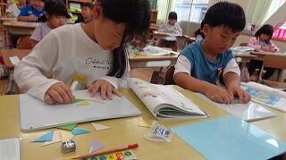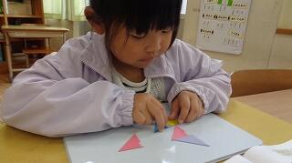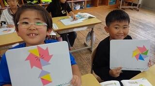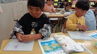 10月24日(金)、1年生の算数「かたちづくり」の学習です。色板をつかって教科書にのっている形づくりに一生懸命です。