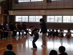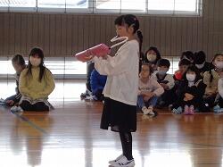 3月11日(月) ボランティア感謝集会が行われました。今年もたくさんの方にご協力をいただきました。学校運営協議会、はげまし隊、安全見守りボランティア、図書ボランティア、コスモスボランティア。50名以上の方が学校の教育活動を支えてくださいました。今日はそのうち15名の方が参加してくださいました。まず、代表児童のお礼の言葉に続いて、6年生がみんなで育てたコスモスの種をプレゼントしました。次に、子どもたちのアイデアでできた、得意なことを見せて感謝の気持ちを伝えようというコーナーには、自ら手を挙げて30名の児童が参加してくれました。けん玉、なわとび、リフティング、タンブリング、柔軟、音読、こま、ピアノ、お笑い、キャッチボールとそれぞれが自分の得意技を披露してくれました。中には、一人で披露してくれた子もいました。最後はみんなで「ありがとうの花」を合唱しました。ここ数年、コロナの影響もあり実施できずに、久しぶりの開催でした。子どもたちの活躍で、数年分の思いを込めて感謝の気持ちを伝えることができたと思います。