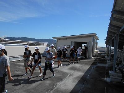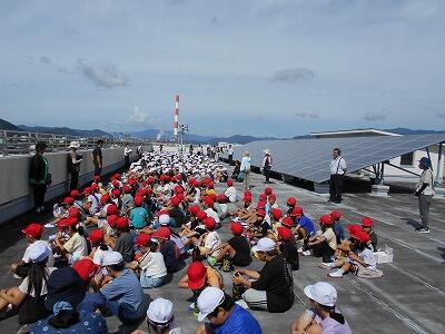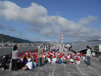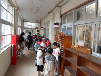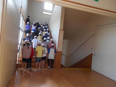 その後、津波警報の音とともに、児童は先生の指示に従い屋上へ避難しました。今回は、実際に屋上へしばらく避難することを想定し、「帽子かぶる」「上履きをはく」、「ハンカチ・ティッシュを持つ」、「水筒を持つ」ことを確認し屋上へ集まりました。全校児童が大変静かに落ち着いて避難でき、大変素晴らしい避難訓練の姿でした。