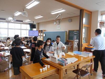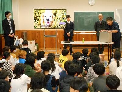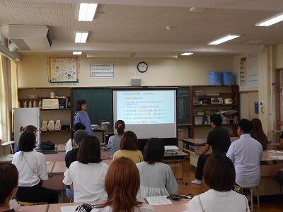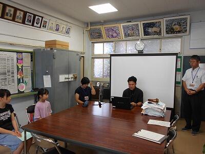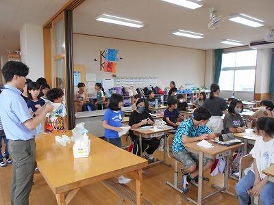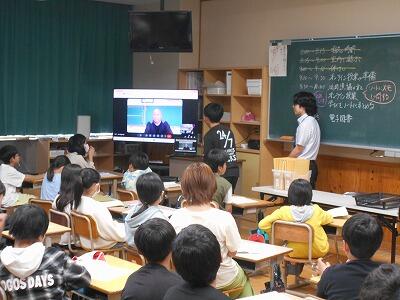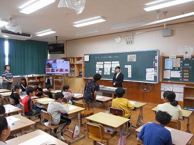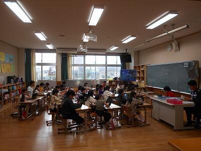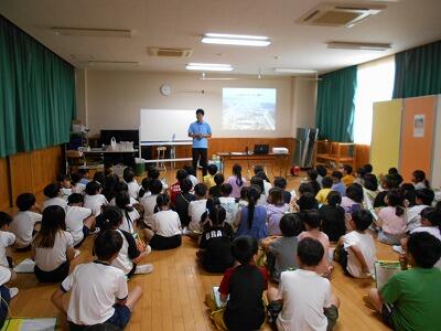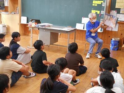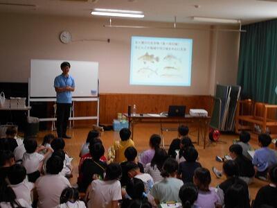 五ヶ瀬川の上流域、中流域、河口域で異なる魚の種類や魚以外のカニや鳥などの生き物について、ご紹介いただきました。子どもたちは、興味深く話を聞いたり、スライドを見たりして学んでいました。山田様、このような学びの機会をいただきありがとうございました。