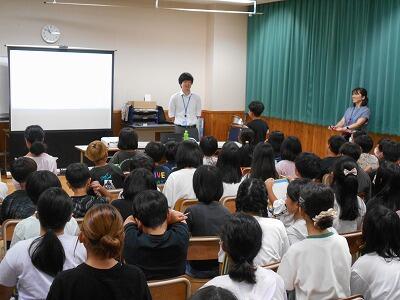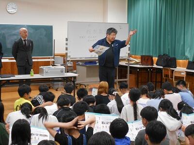 令和7年6月26日(木)に、3年生を対象に、五ヶ瀬川の自然環境について講話をいただきました。講師は、五ヶ瀬川流域ネットワーク理事長(館長)の山田大志様です。