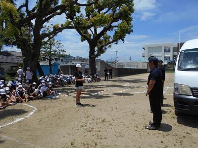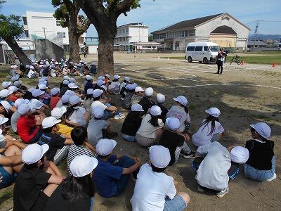 避難後は、熱中症が心配なため、すぐに教室に戻り「校長先生の話」の時間で、振り返りと確認をしました。
