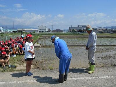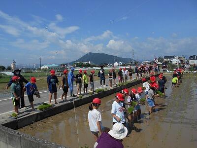 令和7年6月27日(金)に、5年生が田植えの体験学習を行いました。