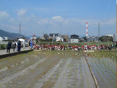 朝よごれてもいい服に着がえた後、外にならび、いよいよ田んぼに出発しました。田んぼに着いて、はま田さんの話を聞いた後、さっそく田植えが始まりました。最初は、ジャンボタニシやおたまじゃくしなどがいて、少しあせってしまいましたが、少しするとなれてきて、どんどんいねを植えるスピードが上がっていきました。みんなと息を合わせられるように「はい、じゃんじゃん。」「はい、どんどん。」などのかけ声でみんなを盛り上げながら田植えをしました。他のクラスがやっているところを応えんするのも楽しかったです。