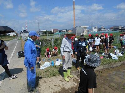 晴れわたる青空のもと、学校の近くにある田んぼを長年にわたりご提供いただいている濱田さんのご指導をいただきながら活動しました。これまで収穫した際に餅つきをしていたのですが、その際に中心となってくださっていた寺田さんもいらしてくださいました。
