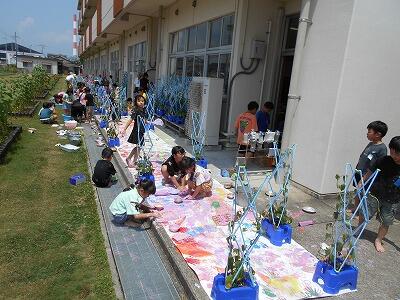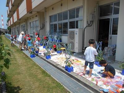 そして今回は、その色水を使って広くて長い紙に、思い思いに素手を使ってカラフルな模様を描いていきました。1年生の3クラス分をつなげた長い紙なので、みんなの力を合わせたステキな大作ができました。